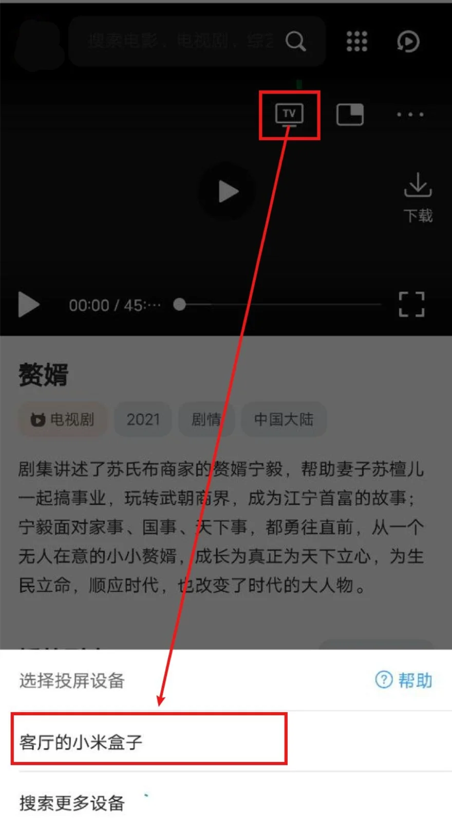 打开QQ浏览器(会接管网页播放器)->打开五杀电影->播放视频->选中投屏图标->等待搜寻出智能电视/电视盒子->选中,即可投屏。
